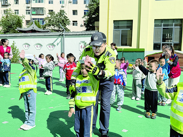 教幼儿学习交通指挥手势。图片由贾星恺提供