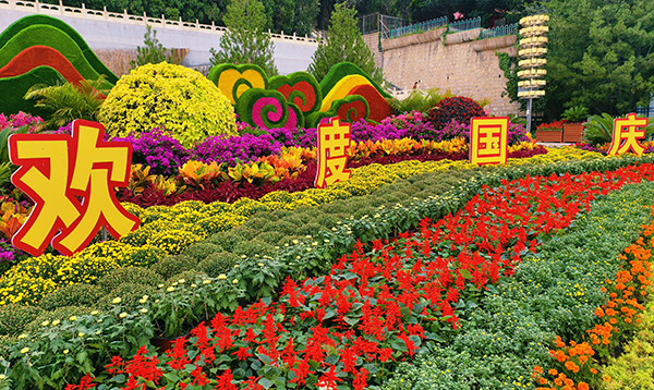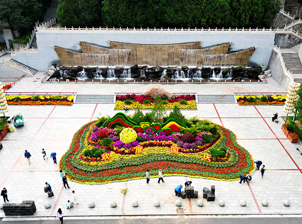 随着国庆节的临近,市园林绿化中心组织工作人员精心布置国庆主题景观花坛,为市民营造喜庆祥和的节日氛围。图为9月21日,工作人员在南山公园北广场布置国庆主题景观花坛。晋向华摄