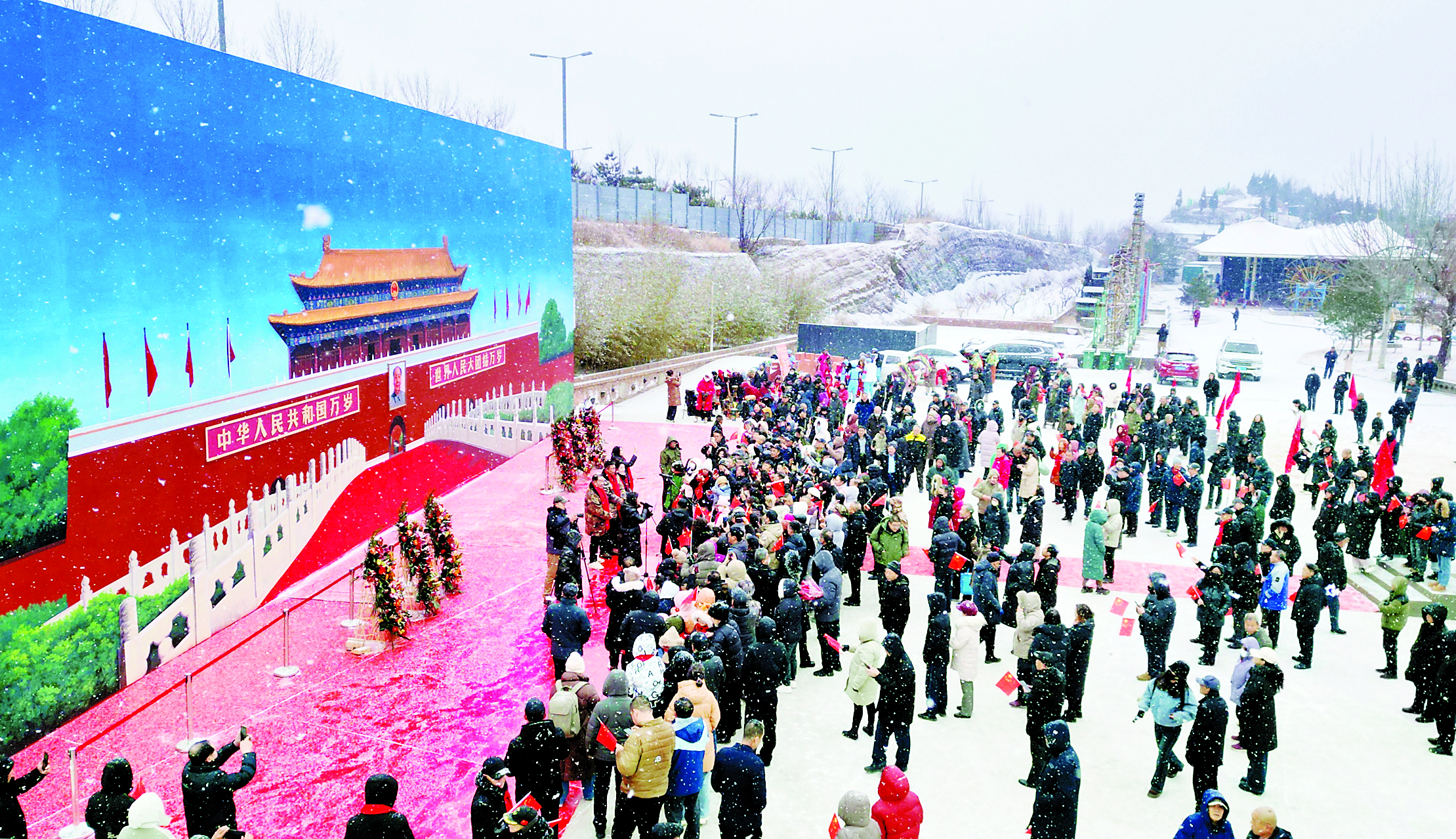 1月18日,郊区平坦镇桃林沟景区内欢声笑语、喜气洋洋,备受关注的巨幅“天安门”彩绘墙落成,市民、游客纷纷冒雪来到彩绘墙前打卡、拍照留影。