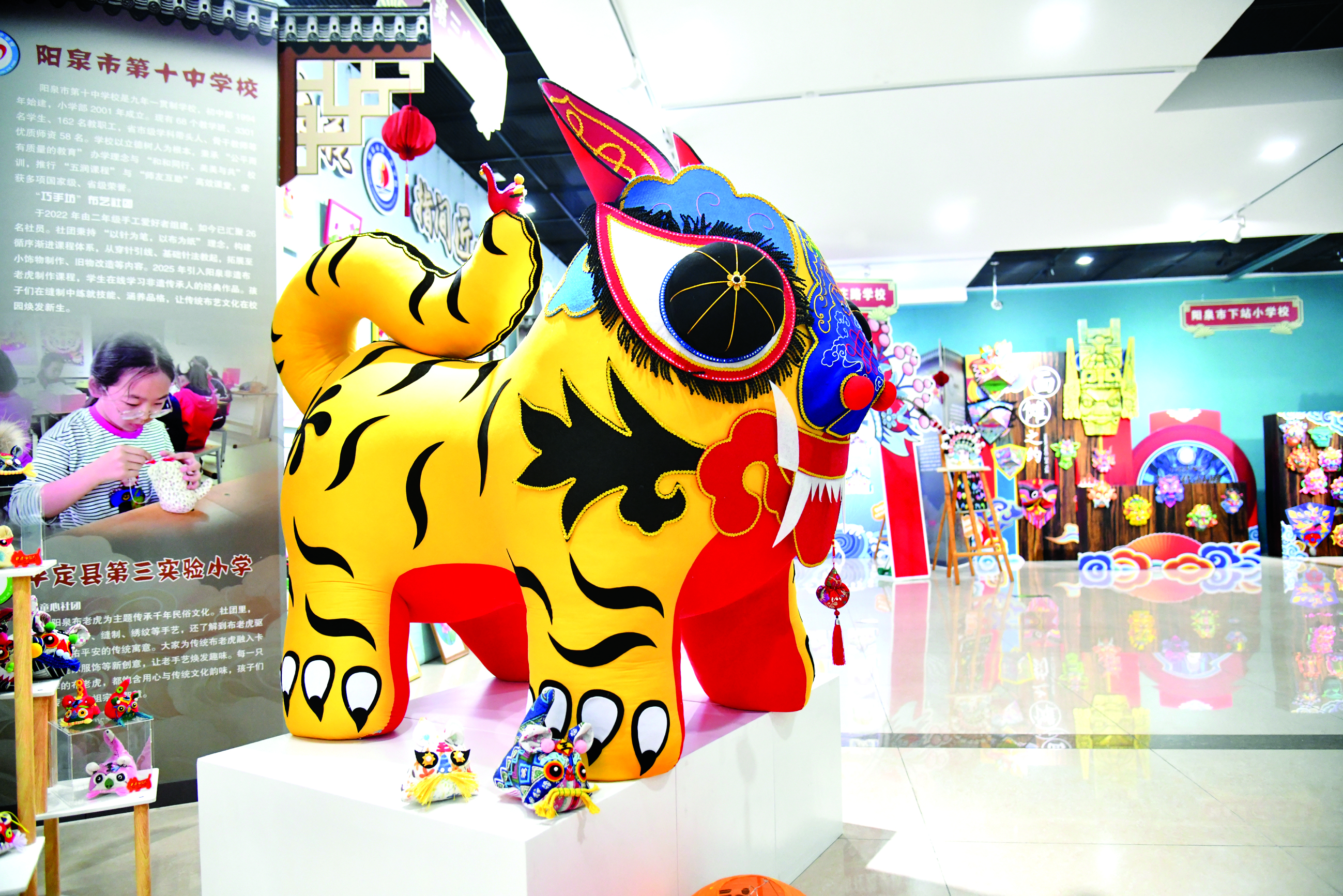 2月4日,“非遗在校园 展览馆里过大年”阳泉市中小学生优秀非遗美术作业展在市展览馆(美术馆)开展。展览汇集全市29所学校、1800余名师生与非遗技艺传承人联袂打造的布老虎、面塑、陶塑、紫砂、纸傩、剪纸等多种非遗作品,生动展现了我市中小学艺术教育成果,反映了全市中小学生积极向上的精神面貌,每一件作品都能感受到非遗在校园扎根生长的精彩缩影与我市历史记忆的文化根脉。刘 胜摄