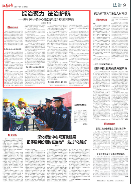 从老旧小区里崭新的热力管道与平整的路面,到居民冬季家中稳定的暖意;从企业里劳资双方平和协商的氛围,到邻里间化解矛盾后握手言和的温情;从网格员上门代办民生事项的贴心服务,到群众遇到法律难题时便捷获取的援助……阳泉市以综治中心规范建设为核心抓手,强化部门协同、整合社区与基层各方力量,在解决民生难题、化解矛盾纠纷的实践中,让平安底色更浓厚、法治根基更牢固、群众获得感更真切。