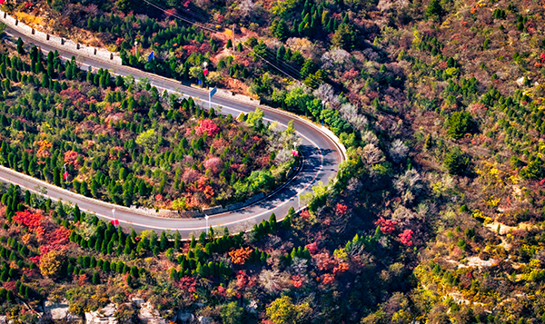 近段时间,狮脑山盘山公路两侧秋景如画,吸引了不少市民前来打卡拍照。盘山公路如丝带缠绕,红、黄、绿交织的植被犹如流动的调色盘,与点缀其间的石砌护栏和路灯相映成趣,将沿线装扮得美不胜收。 图为近日无人机拍摄的狮脑山盘山公路两侧美景。张哲远摄