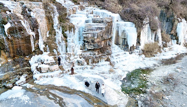 图为1月8日,游客在冰瀑前拍照留念。刘胜摄