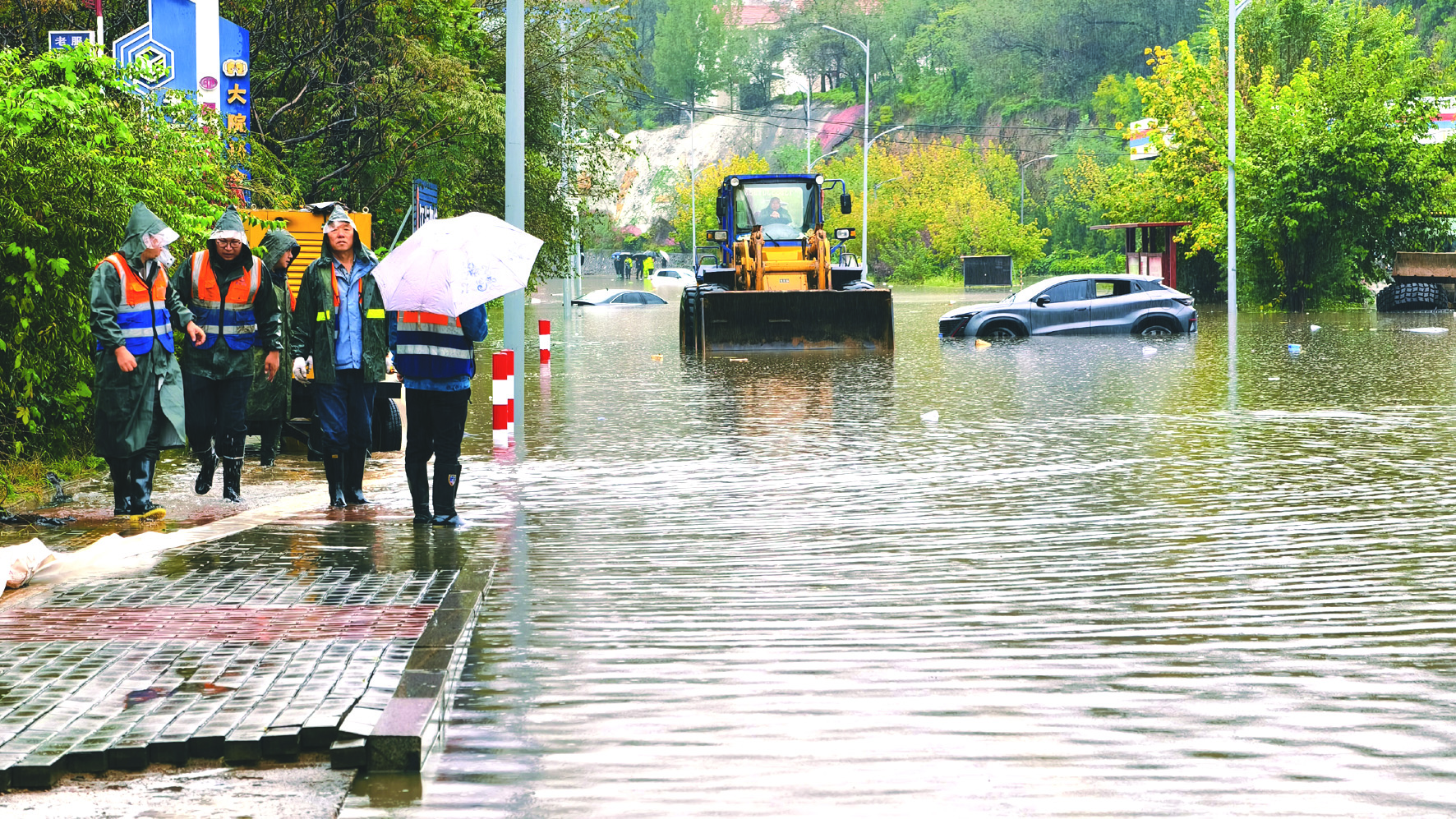 图为十月十日,阳泉路达市政养护工程有限公司工作人员在高新区长岭路段清理积水。晋向华摄