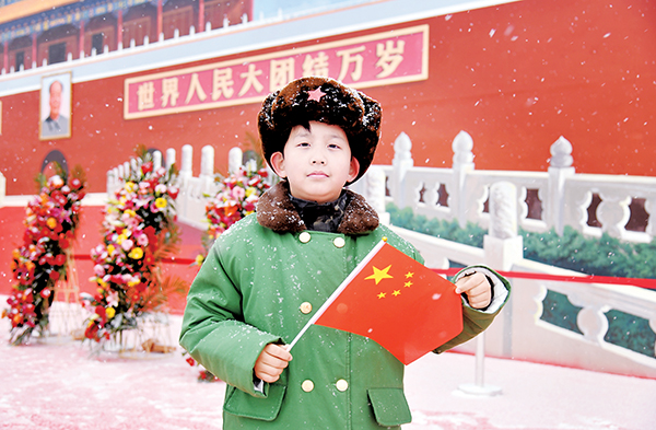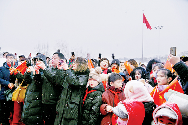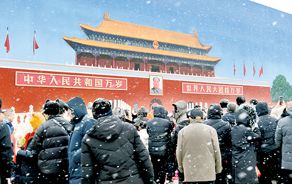 1月18日,郊区平坦镇桃林沟景区内欢声笑语、喜气洋洋,备受关注的巨幅“天安门”彩绘墙落成,市民、游客纷纷冒雪来到彩绘墙前打卡、拍照留影。