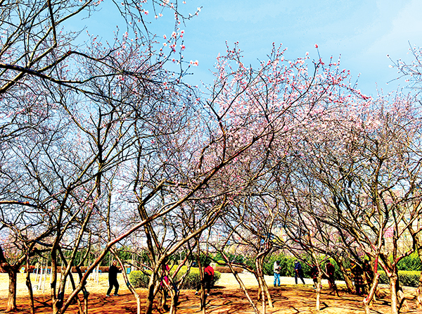 图为3月15日,市民游客在桃河公园内赏花拍照。刘 胜摄