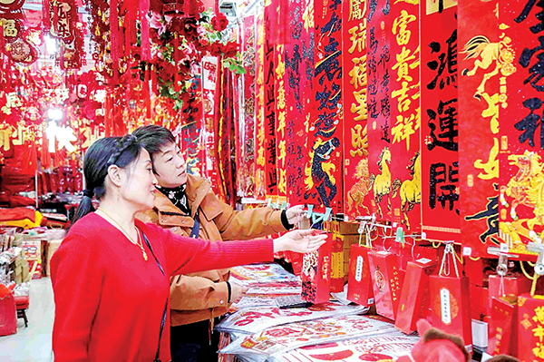 “去年11月底,就有顾客问我什么时候上新马年的新年用品和装饰品。去年12月初我们店便开始备货、铺货,12月20日之后新年用品迎来销售旺季,尤其是对联、‘福’字门贴、窗花卖得特别好。”商铺旭东婚庆的负责人武晓霞说,“光顾我们店选购新年饰品的,大多是零散顾客,批发客群则较为稀少。”周边商铺的负责人同样忙碌,理货、介绍商品、清点货款,他们脸上都带着迎接销售旺季的喜悦。
