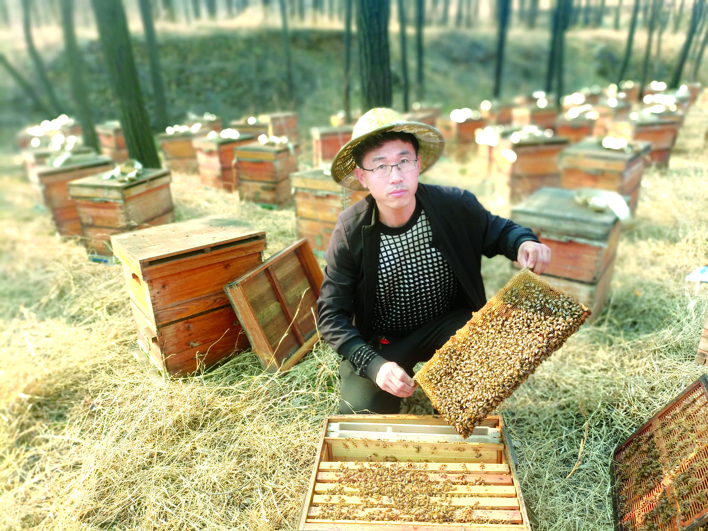 人养蜂,蜂采蜜,蜜养家。这条“追花路”郑鸿江跑了几十年,苦是真苦,但靠着一箱箱蜜蜂,日子越过越好,还获得了“阳泉市十佳养蜂技术员”称号,他用汗水酿造出自己的“甜蜜人生”。(张 洁)