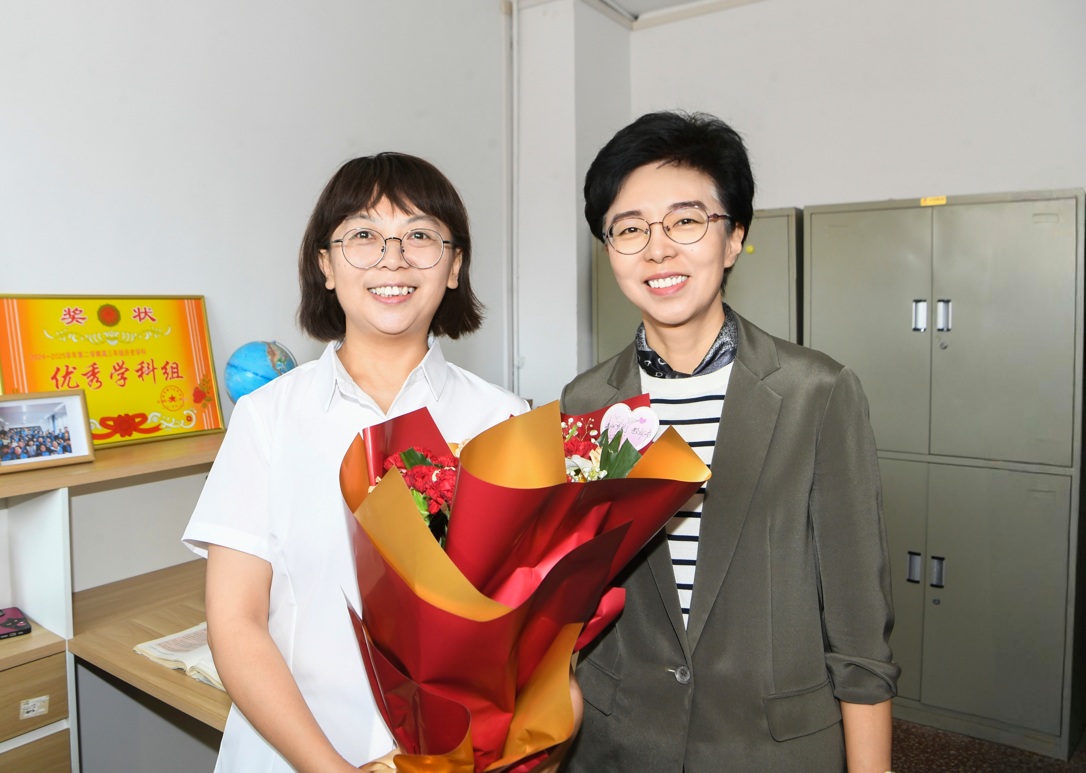 教师代表薄晓敏、安敏长年坚守教书育人一线。来到该学校教师办公室,雷健坤为她们送上鲜花,并亲切握手交谈,详细询问工作、生活情况,感谢大家长期以来的辛勤付出,提前祝大家教师节快乐。她强调,教师肩负着新时代教书育人的神圣使命。要大力弘扬教育家精神,持续涵养高尚师德师风,扎实做好传道、授业、解惑的工作,当好新时代“大先生”,努力培养德智体美劳全面发展的社会主义建设者和接班人。